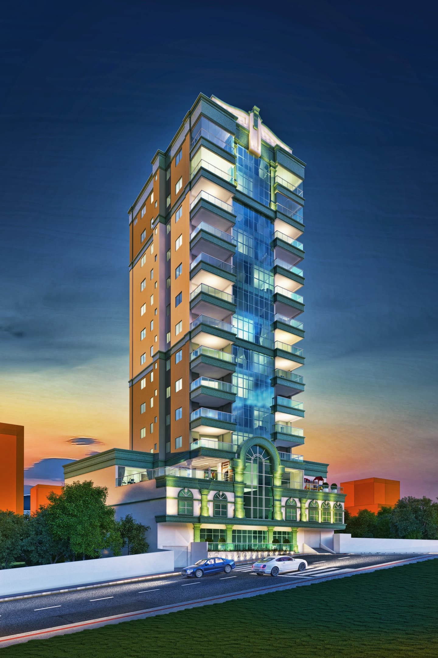 As unidades padrão possuem três suítes, teto rebaixado em gesso e piso em porcelanato. Dispõem de living para dois ambientes, cozinha, espaço gourmet com churrasqueira, área de serviço e lavabo. A infraestrutura inclui tubulação para ar-condicionado tipo split e para água quente, proporcionando praticidade e conforto térmico. O empreendimento conta também com duas unidades duplex exclusivas, cada uma com quatro suítes e amplo espaço interno, oferecendo ainda mais privacidade, conforto e requinte aos moradores.
